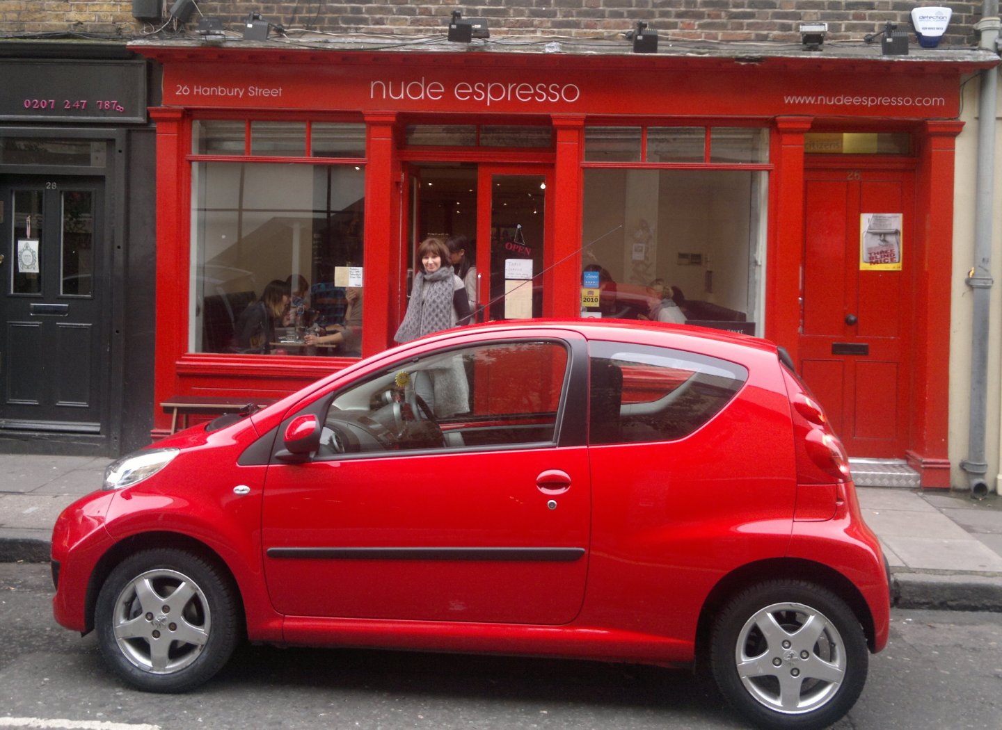 This is the Winner of Independent Café of the year UK 2010 awarded by the Café Society. A micro-roastery. Good coffee, by the way, something you don’t get in London very often. I am not advertising the shop, though the option of “taking my espresso nude” can be mildly entertaining. I am celebrating the style of people who, when choosing a place to have coffees, take the colour of their car into consideration.