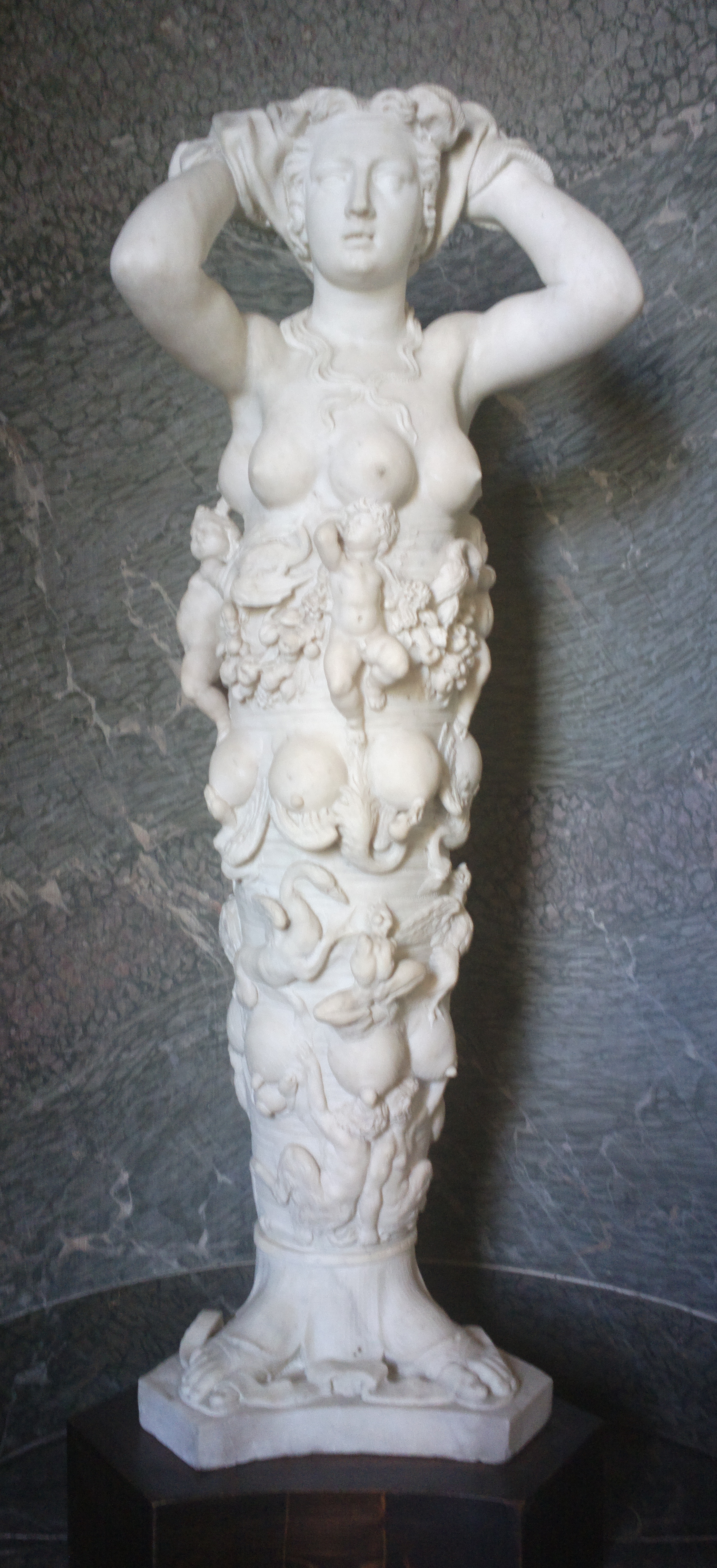 The French castle of Fauntainebleau houses the symbol of men’s allegorical hypocrisy about tit-staring. It is a sculpture by Niccolo Pericolli, made in 1529. The allegory of nature. It is so titillating that its original purpose (to support a vase) was forgotten and it has always been exhibited like this.