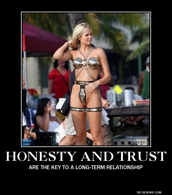 Well. The girl in the picture wears iron belt and bra that are locked in a way that makes any sexual contact possible only for the person who’s got the key. The joke here is that while trust is believed to be the key to a successul relationship, this trust in this particular case, is very much dependent on making dishonesty not an option 😉 So, in terms of suitability to the article, I thought of this picture as a wink )