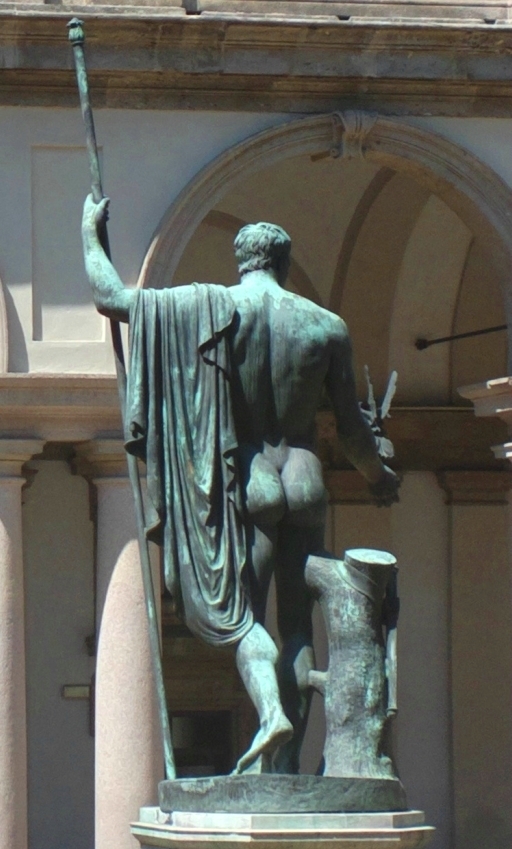 There is a naked bronze man In the courtyard of a famous picture gallery.