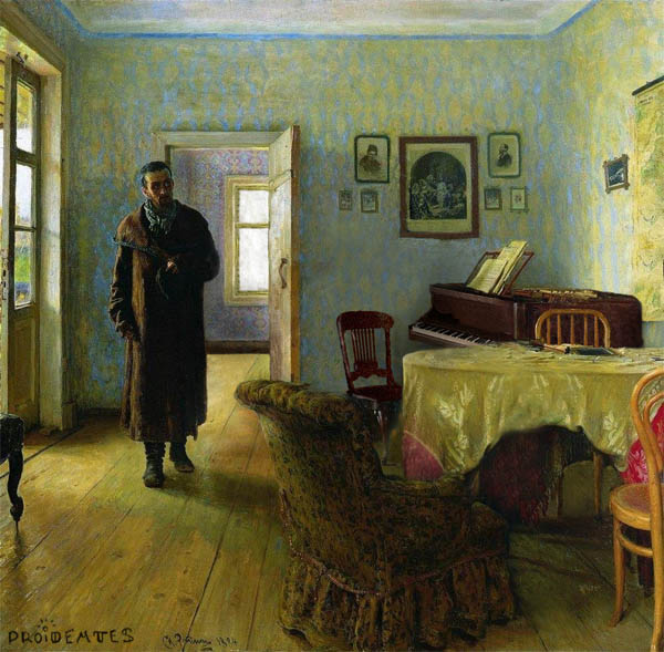 Repin wanted to show a revolutionary, from an upper middle-class family, who comes back home from exile.