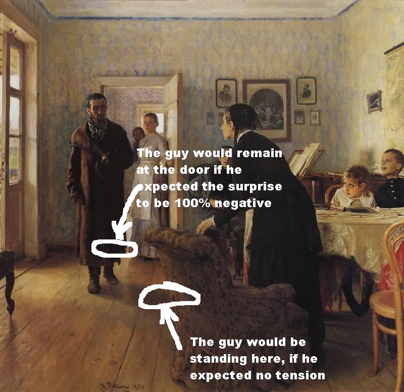 There was a realistic Russian painter who pulled off the trick of painting surprise, and not just positive or negative, but mixed the way James Bond would hate, were it applied to his Vodka Martini. Very well mixed, not just shaken.