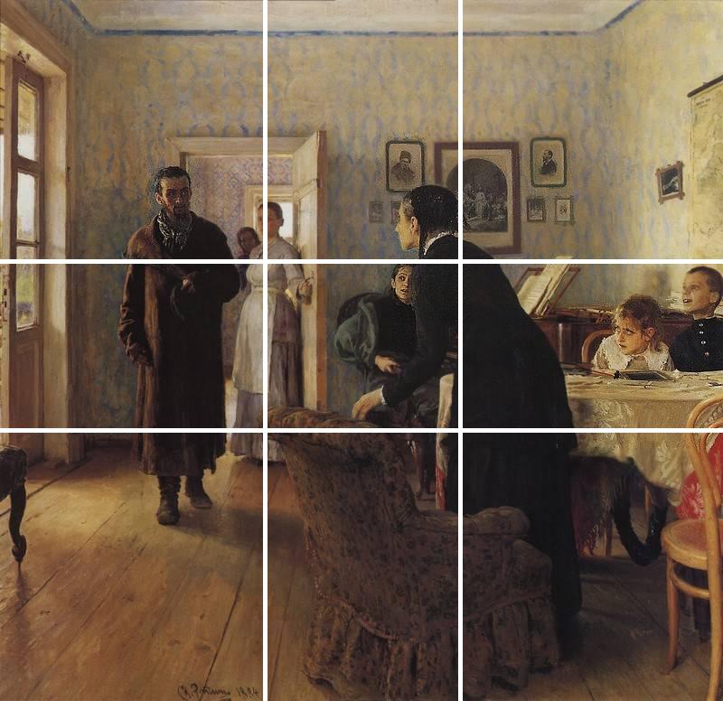 The painter’s name was Ilya Repin. He was 40, when he did this painting, surprisingly named by a verb, not a noun. “Didn’t Expect”, painted in 1884.
