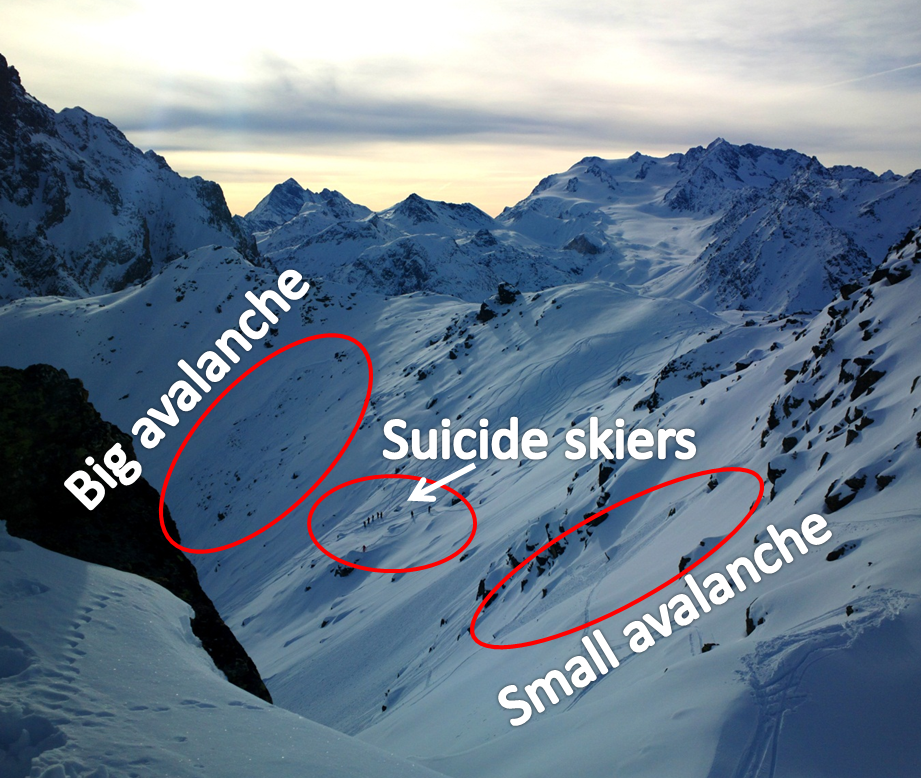 Now you can appreciate the strength of character utter stupidity of skiers who decided to play with the mountain choosing the path between two avalanches.