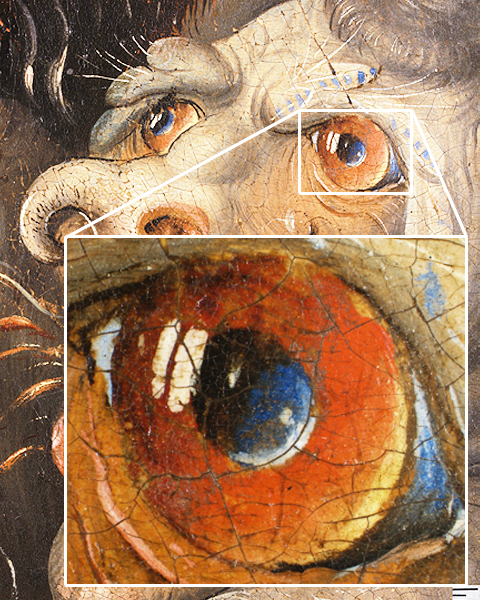What is most remarkable about this painting though – and I can’t miss it even though it takes me off the main track – is its monster community. Each monster is individually unique and mesmerizingly frightening. My favourite is this multi-faced green guy:
