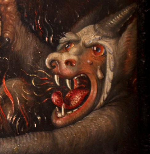 Seeing that devilish creature upon resurrection can send a man back to the grave with a heart attack, which is rather ironic. And yes, if you look to the right of the cutie, you’d realise a beer belly takes you to Hell, with the weighting of the soul being no longer necessary. My other fav is the face of the monster relaxing in Hell at the very right corner of the painting: