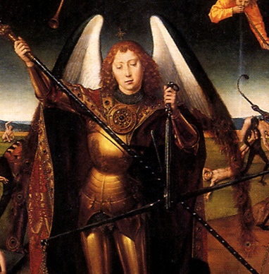 An interesting detail is the use of peacock feathers (quite traditional at the time) in angels’ wings. Archangel Michael is especially endowed in this respect: