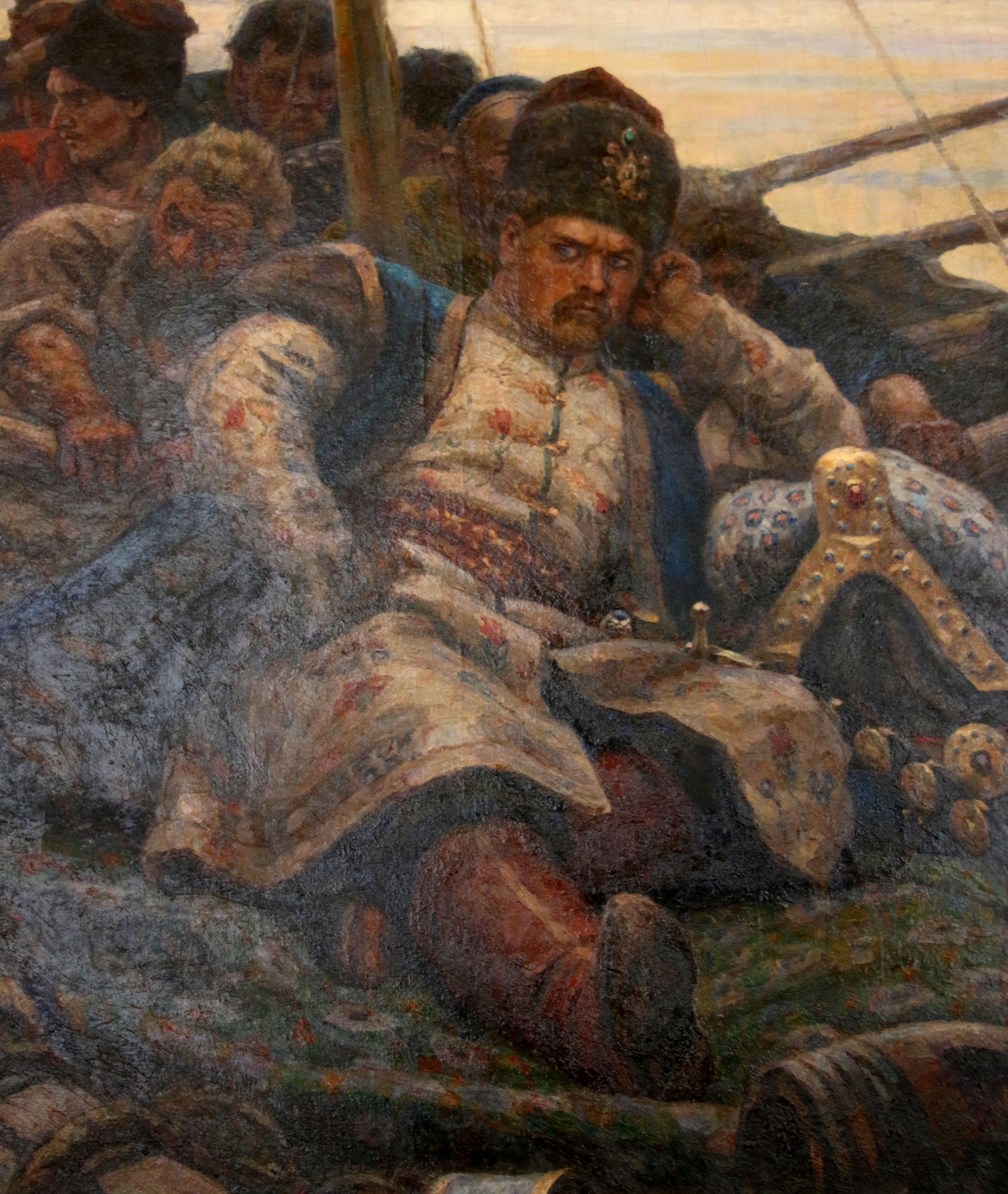 This work by Vassily Surikov, a Russian artist of the late 19th-early 20th c., who specialised in large-scale history paintings, shows Stepan Razin, the leader of a massive uprising in the 1670s. Razin, deep in thought about the future of his rebellion, is being carried in a boat by his loyal cossacks. Some of them are laughing or sleeping, but there’s that feeling of a foreboding doom that permeates the scene (Razin was wounded, apprehended, and quartered, eventually).