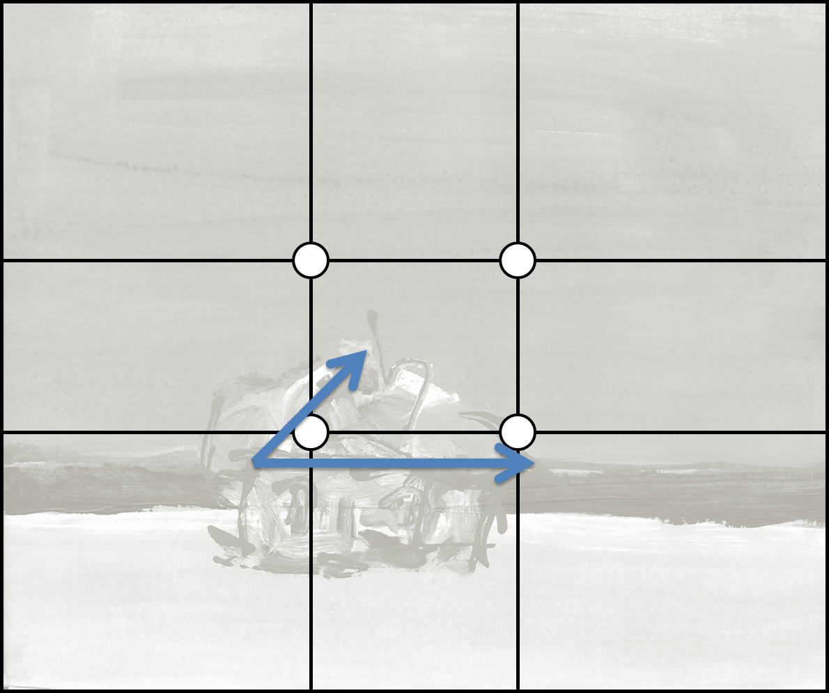 This dynamism is provided by a perfectly proportioned positioning of the hut just at the border of the centre of the painting, to which the eye wants to draw the house, and the slanted lines of the roof indicate this direction: they prompt the eye to drag the shed up and to the right .
