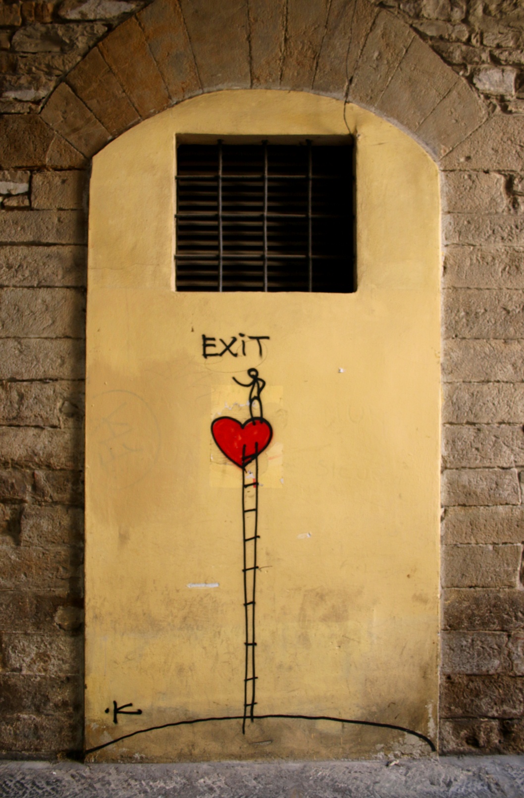 3. My first thought when I saw the image was ‘love is difficult to achieve but once you do, it is an exit from the prison of the mundane’. On a second glance, the EXIT sign is beyond the reach of the human figure who seems to be facing the viewer and waving (unless he is a left handed artist and is about to draw on the wall) which brings to mind the song ‘babe sometimes love just ain’t enough’. Right. Pouring myself another drink…