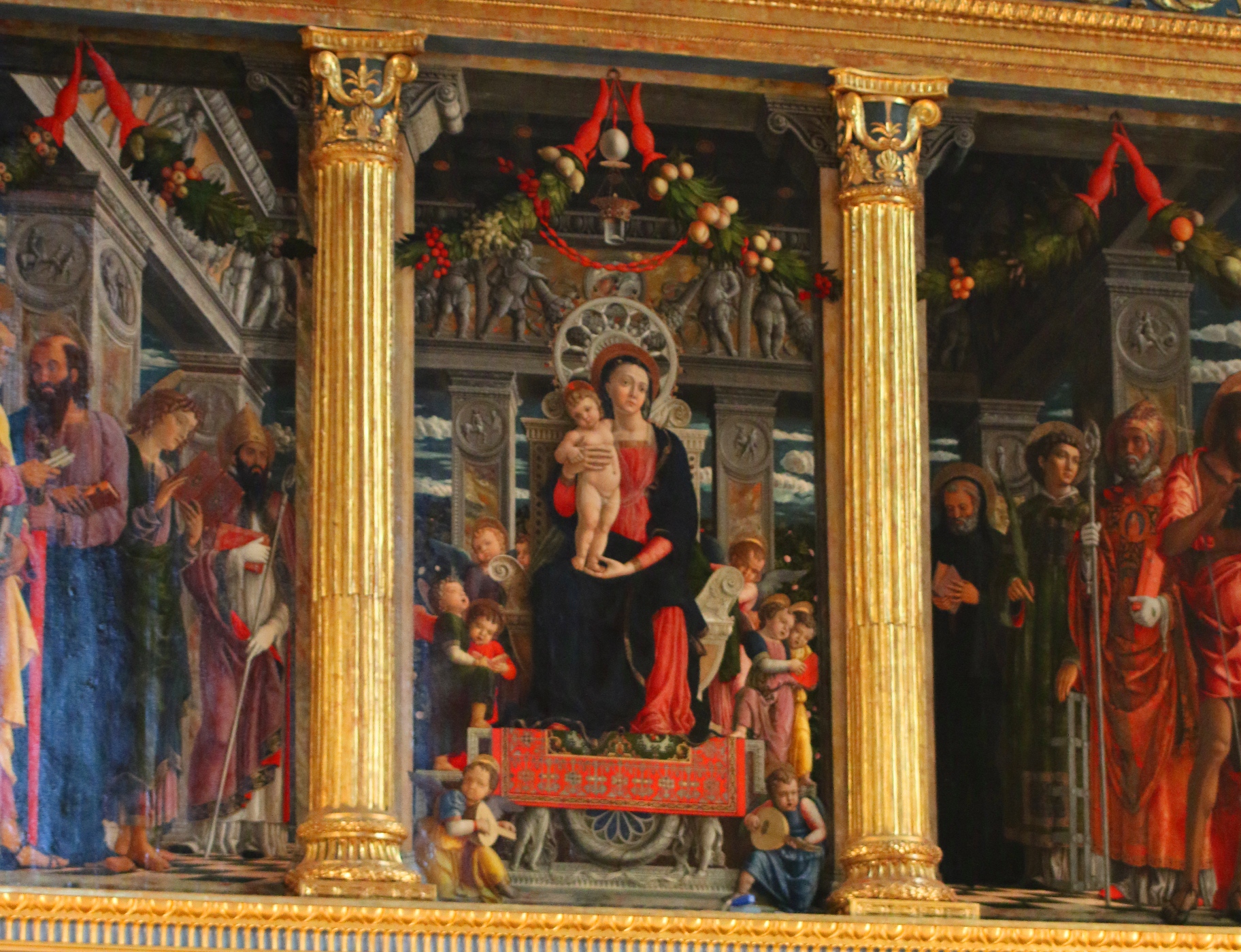 This wiki image doesn’t begin to convey the beauty of the work. The colours, for one thing, are totally off-key. Quality images of the San Zeno altarpiece are rare. It is one of the worst-exhibited masterpieces in the world.