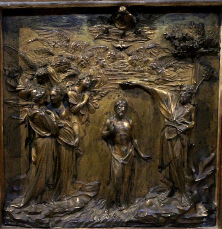This is the Baptism of Christ by Lorenzo Ghiberti. John the Baptist pours water over Christ’s head, the Holy Spirit descends from Heaven, spectators look at each other in amazement, and angels rejoice and flutter their wings. A good film director would probably show the trembling hands of St.John, who is accomplishing his prophetic mission, the exalted face of Christ, spectators watching the miracle and clasping their hands in amazement… Yet, Ghiberti’s work is static and flat. All the characters in this drama exist on a single plane, with depth represented by angels’ reliefs thinning out…towards the non-existent horizon? Or towards Heaven? And why would they be flying in this strange formation?