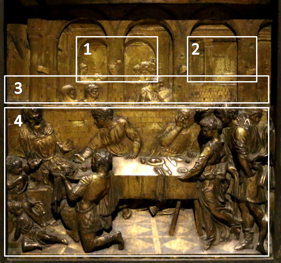 Donatello adopted the perspective inventions of Brunelleschi, his friend and mentor, in sculpture. He broke up with the Gothic past, paving the way for the realism of the Renaissance with the Man in the centre. It can be best seen when you compare his work to his contemporaries. I will show you the difference, easily illustrated by the bas-reliefs in Siena’s Baptisterium on which Donatello worked together with his former teacher, Ghiberti.