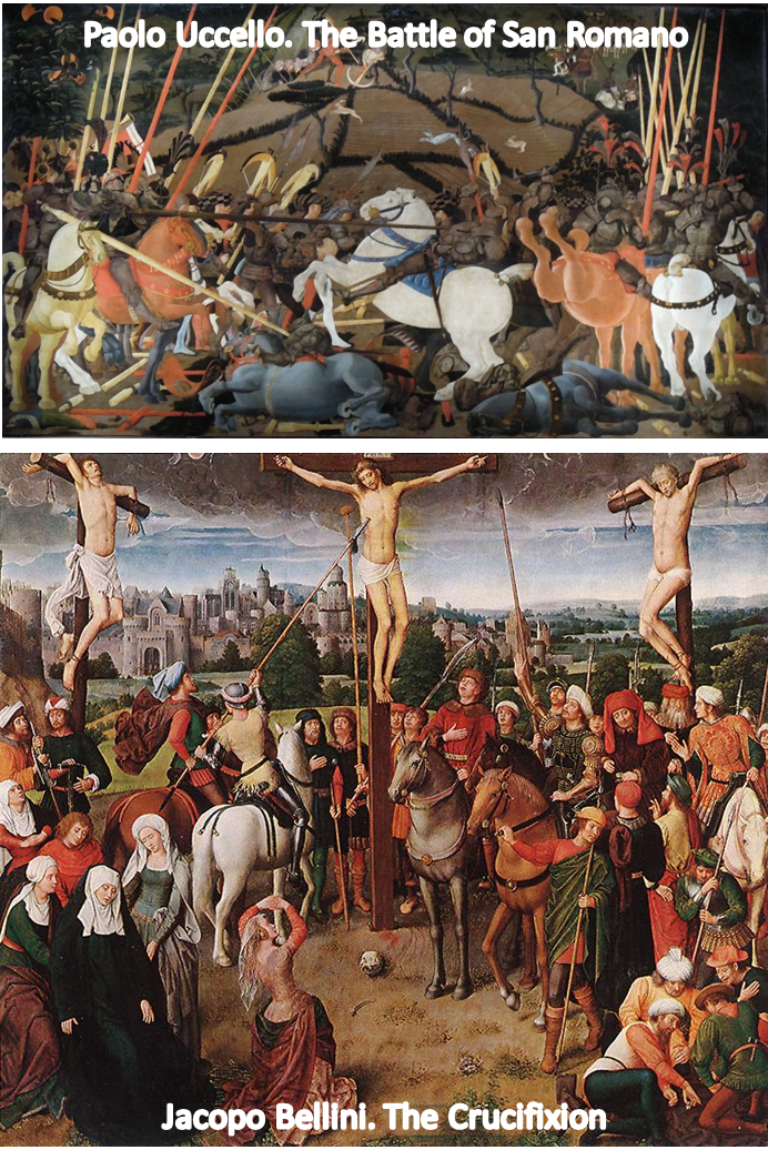 The rhythm and movement are both the influences of Uccello and Bellini, clearly visible in the Crucifixion predella. I am putting Uccello and Bellini together so that you can appreciate the extent to which Mantegna’s future father-in-law was fascinated by the Uccello’s visual trick when the spears denote lines of action, lines of sight, and groups of people in a complex composition:
