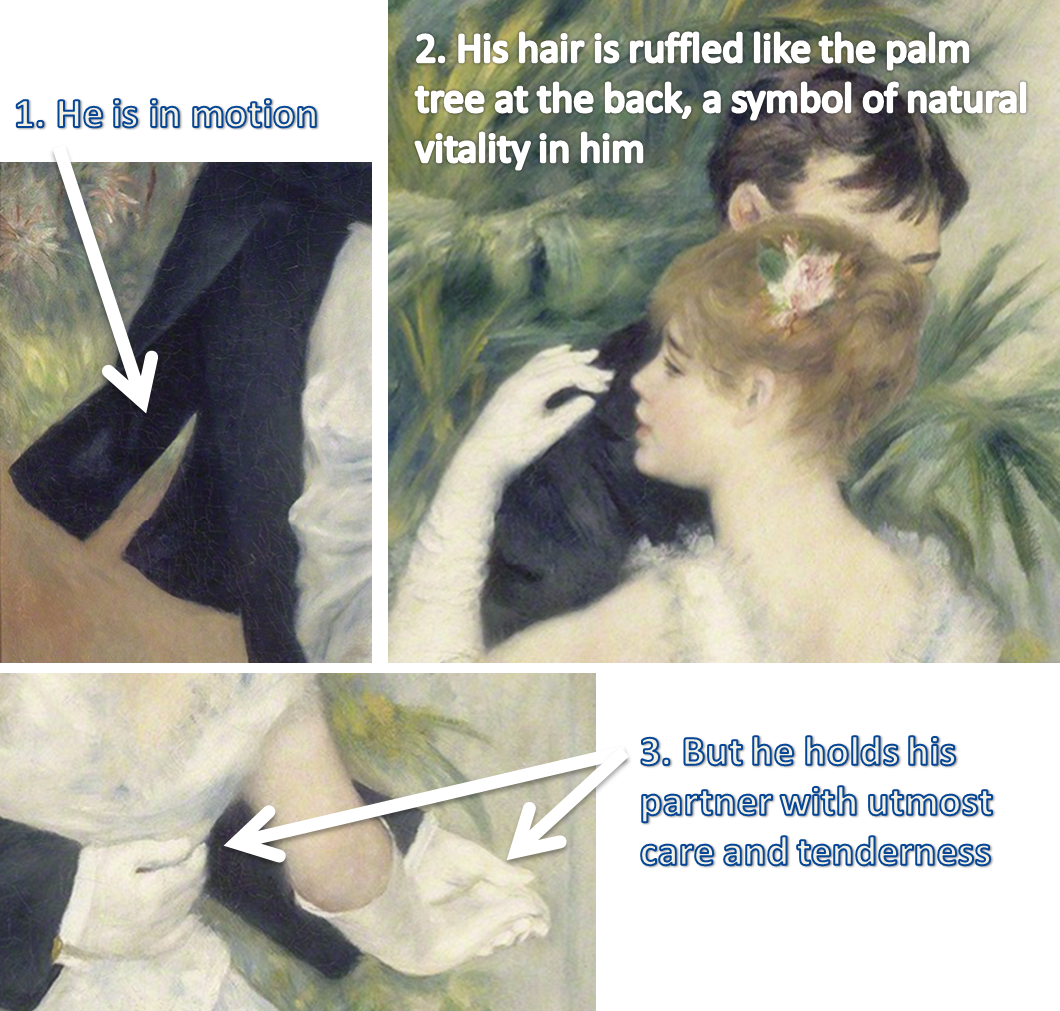 While she maintains her barrier at the top half, she’s quite flirtatious at the bottom: look at how her dress is painted against his leg. First, there is no separation between her dress and his suit, it looks like an Yin Yang symbol. Second, it’s the tiny details that you can only see up close and personal.