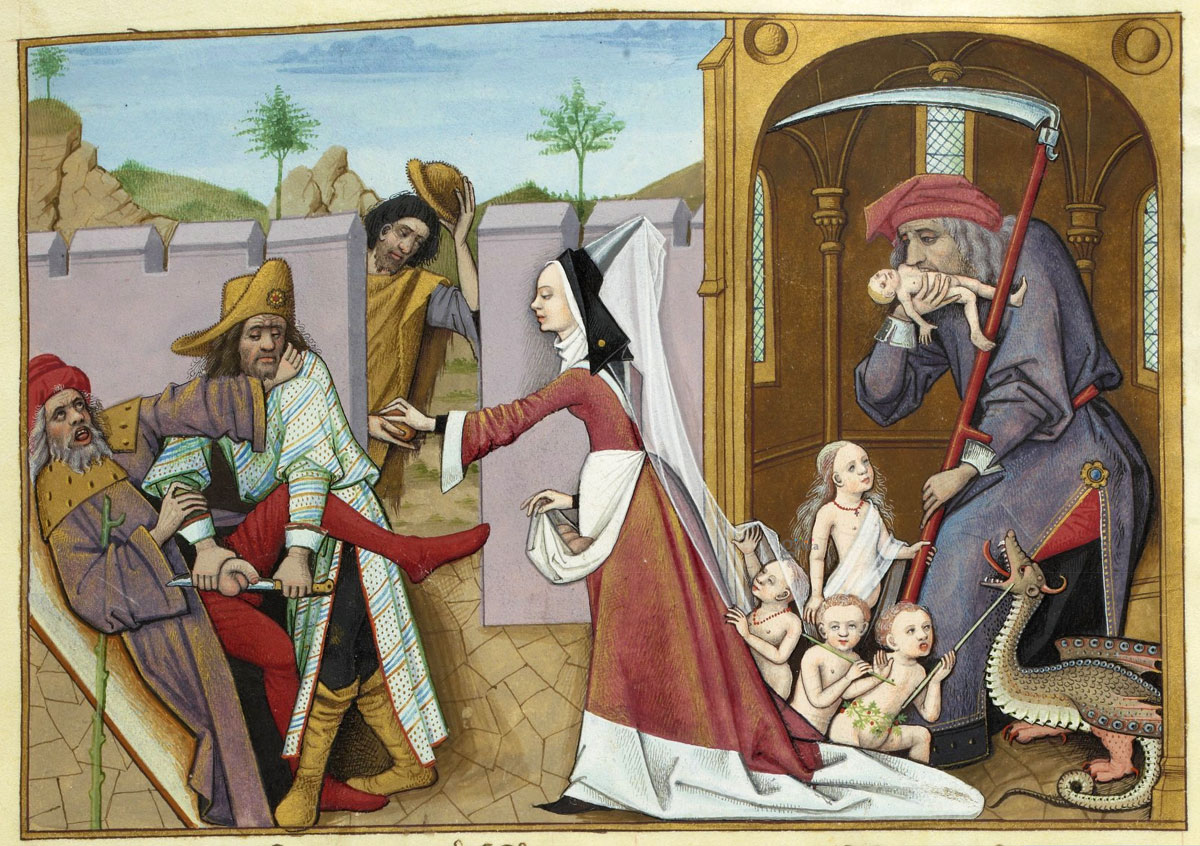 My wonderful reader Neda was spot on with her suggestion that this is a mediaeval view on the Greek myth of Cronos. It is a well-known story, but mediaeval clothes of the characters are muddling the brain.