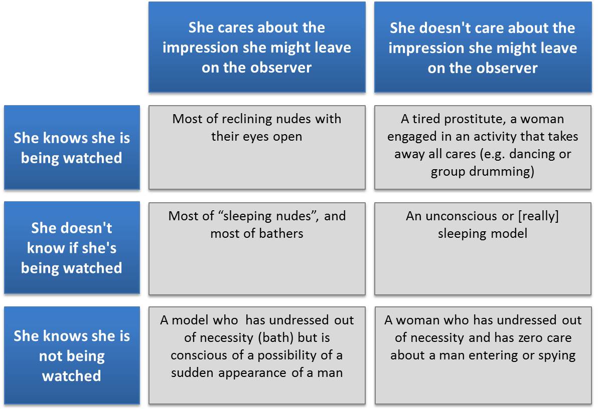 If – as I believe – she covers her face in shame, she falls in the traditional top right box with all the Titians, Manet, Ingres, and countless others.