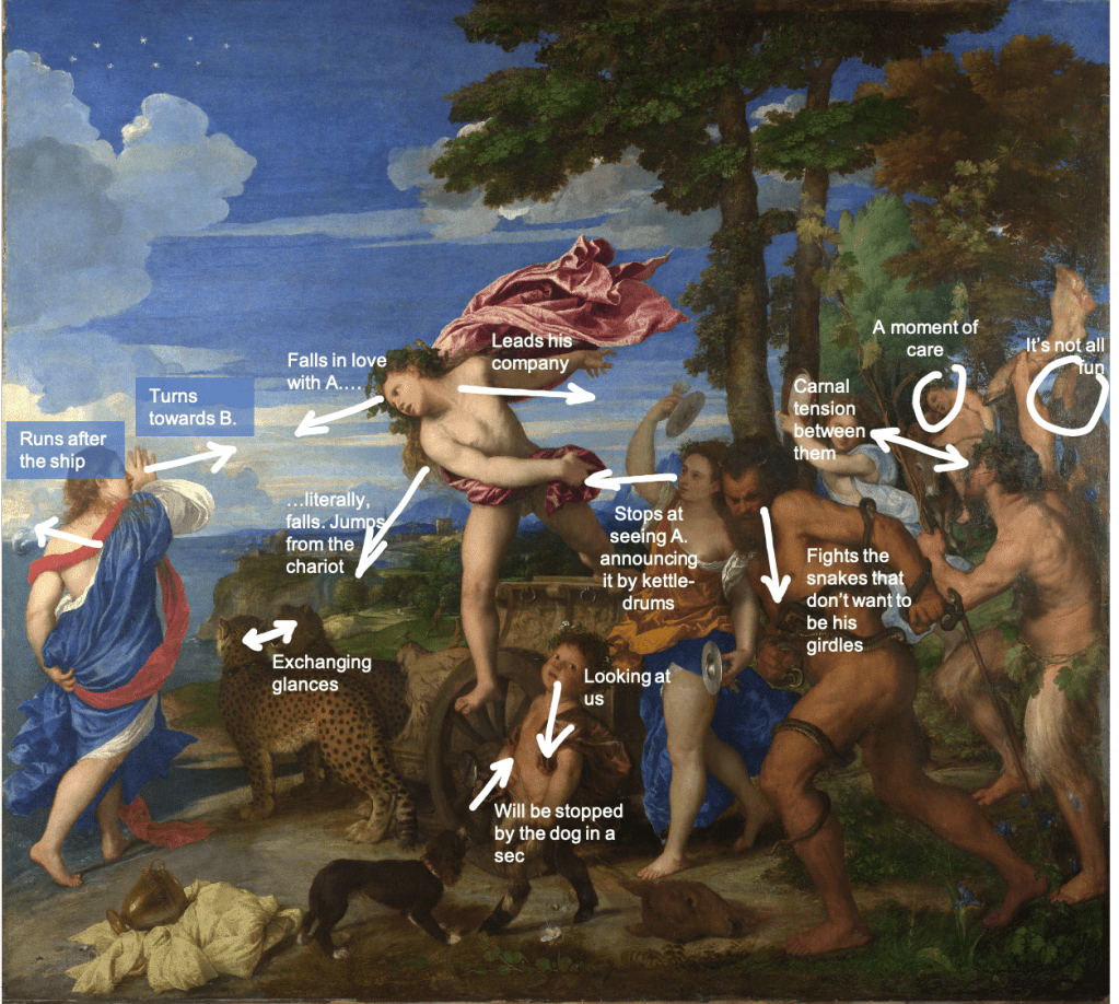 I encourage you to read more about it because I don’t want to rewrite and repeat the wiki page. I intend to expand on it. Here’s the painting’s wiki page, and here are the original stories, by Ovid and Catullus. The two stories have differences between them but don’t try to “spell-check” Titian’s imagery against any one of them. None of the stories reflects what was really happening anyway. For starters, there are no forests on the barren piece of land that is Naxos.