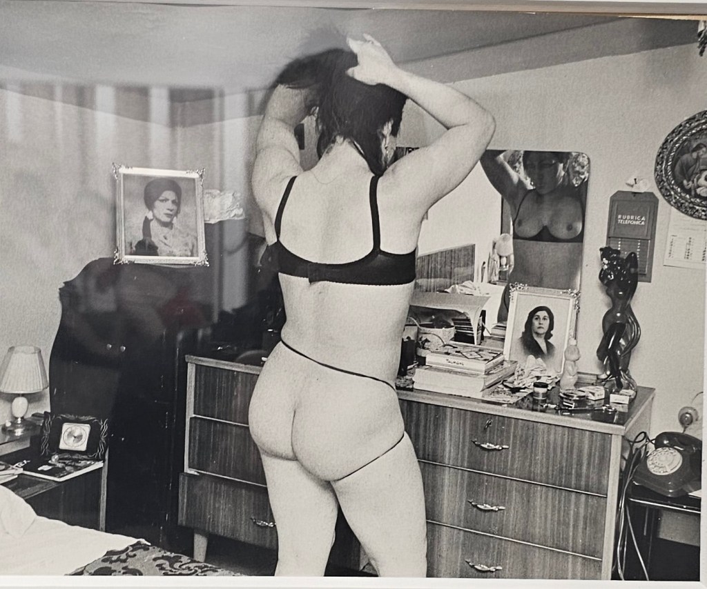 It is Italy in the 1970s. The woman is posing in front of and watching herself in the mirror, trying the pose of the statuette on the top of the chest of drawers (1). Society is OK with people putting this kind of bourgeois art on their shelves but doesn’t approve of women presenting themselves in this way. Still, she wants to show and understand her own beauty. Self-awareness is in her own eyes – she is studying herself. Her “exhibitionism” is the eyes of a woman of her age (maybe it is even her own portrait) (2). That woman watches you, the viewer, recording and studying your reaction to the model’s body. The older lady in the photo below the mirror (3) – the model’s mother? – us looking up at the model without much appreciation – it is the judgement of society, and I guess the average viewer back in the 1960s would furrow their brows in disapproval. By the bed, there is a cowboy comic book (4), hugely popular in Italy back then. The model in the photo is definitely past her teenage prime, but her soul, locked away in a cramped Genoese flat, wants to fly into the strong arms of a prince in shining armour. It is the same soul that is guarded by the Virgin on the other side of the bed (5). The lingerie on the model is obviously of a sexual nature. Is she expecting some cowboy now, with whom she would be making love under the watchful gaze of the Madonna? Or is she just dreaming about one, having put on this sexy piece to raise the sexual temperature on the inside? We can’t know this. What we can learn from this scene is that our beautiful model is tormented by internal conflicts, torn between her wants, fears and societal norms. And don’t forget about Dad and related issues – there is a Xmas picture on the wall with St.Joseph (6), conveniently cut off his family. What would he say, were he present or alive?